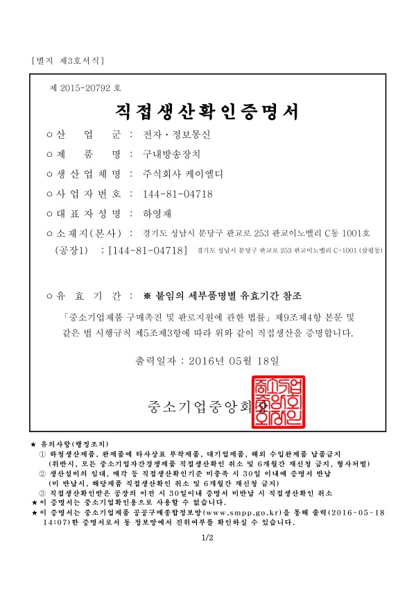 Direct production attested 페이지 정보 작성자 최고관리자 댓글 0건 조회 66회 작성일 16-06-27 09:50 목록 본문 직접생산확인증명 - 구내방송장치 이전글Direct production attested 16.06.27 다음글Certificate for a business annexed research lab 16.06.27
