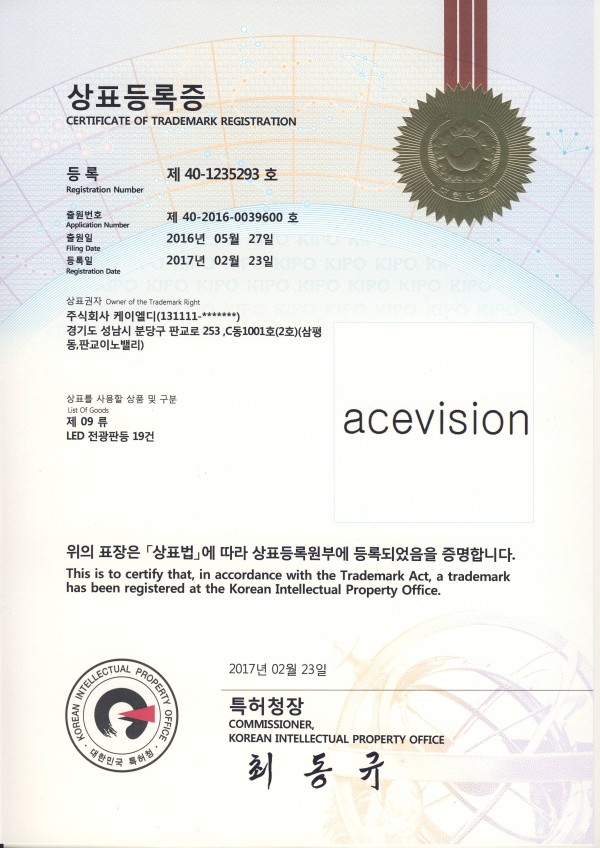 Trademark registration 페이지 정보 작성자 최고관리자 댓글 0건 조회 77회 작성일 17-03-06 10:56 목록 본문 상표 등록 ACE VISION 다음글Flicker Reduction LED Display Board Control Device Method 16.06.27