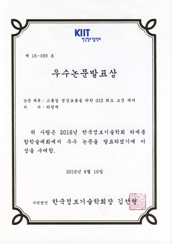 2016韩国信息技术学会 受奖 优秀… 페이지 정보 작성자 최고관리자 댓글 0건 조회 65회 작성일 16-06-27 10:06 목록 본문 2016 한국정보기술학회 우수논문발표상 수상 이전글新技术实用化 16.07.04 다음글2013感谢奖 16.06.27