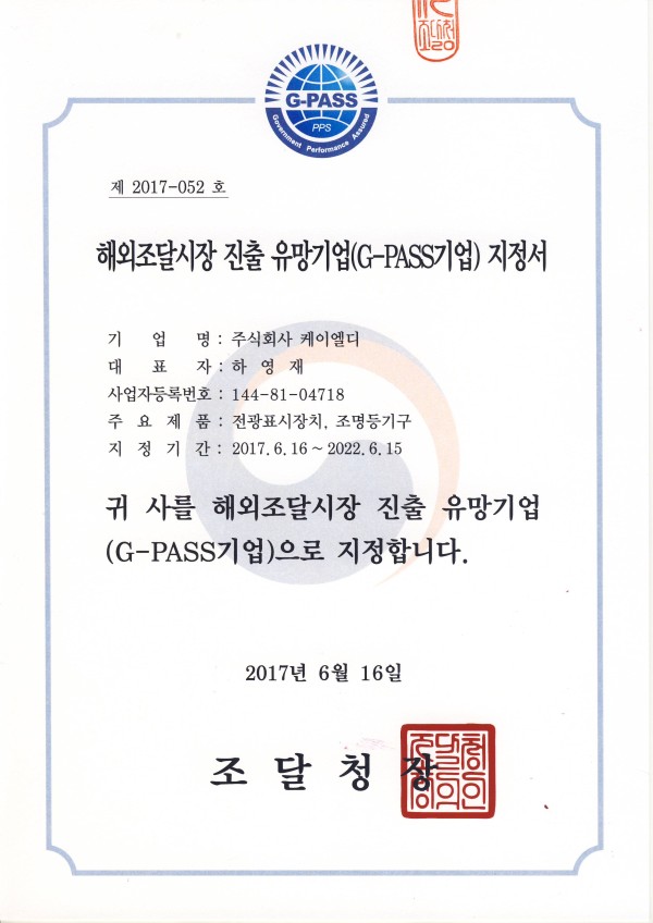 해외조달시장 진출 유망기업(G-PASS) 페이지 정보 작성자 최고관리자 댓글 0건 조회 75회 작성일 17-07-05 09:12 목록 본문 해외조달시장 진출 유망기업(G-PASS) 이전글벤처기업확인서 18.11.27 다음글우선구매선정 확인서 17.01.19