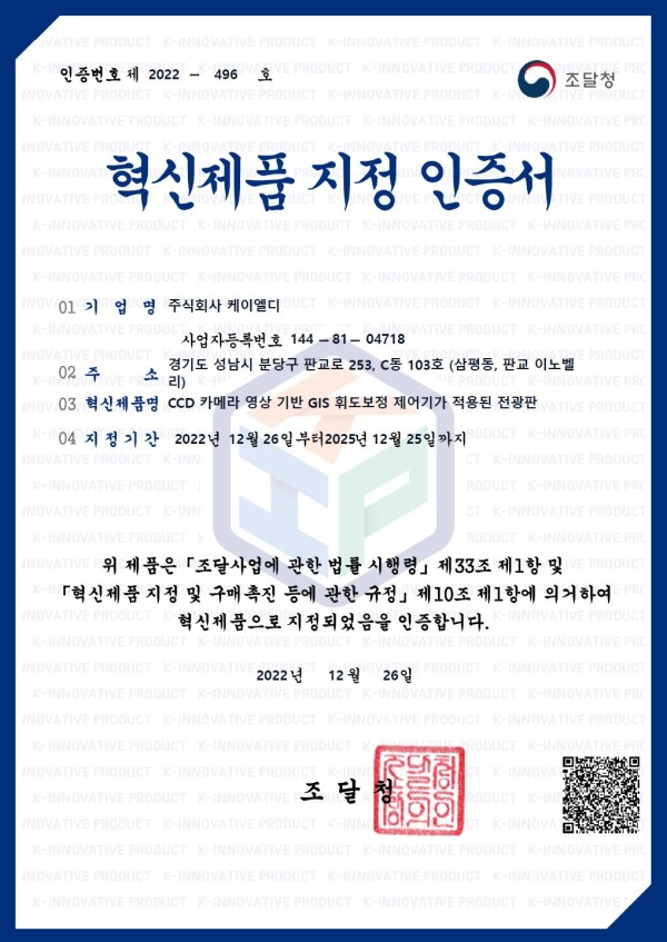 혁신제품 지정 인증 - CCD 카메라 영상 기반 GIS 휘도보정 제어기가 적용된 전광판