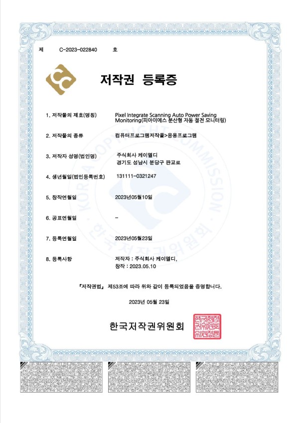 저작권 등록 - Pixel intergrate Scanning Auto Power Saving Monitoring(피아이에스 … 페이지 정보 작성자 최고관리자 댓글 0건 조회 31회 작성일 23-05-23 10:40 목록 본문 저작권 등록 - Pixel intergrate Scanning Auto Power Saving Monitoring(피아이에스 분산형 자동 절전 모니터링) 이전글저작권 등록 - Pixel intergrate Scanning Control Manage System(픽셀 통합 스캐닝 제어 관리 시스템) 23.05.23 다음글저작권 등록 - 평활화 필터 기반의 가상 디스플레이 스캔 제어 프로그램 22.06.29