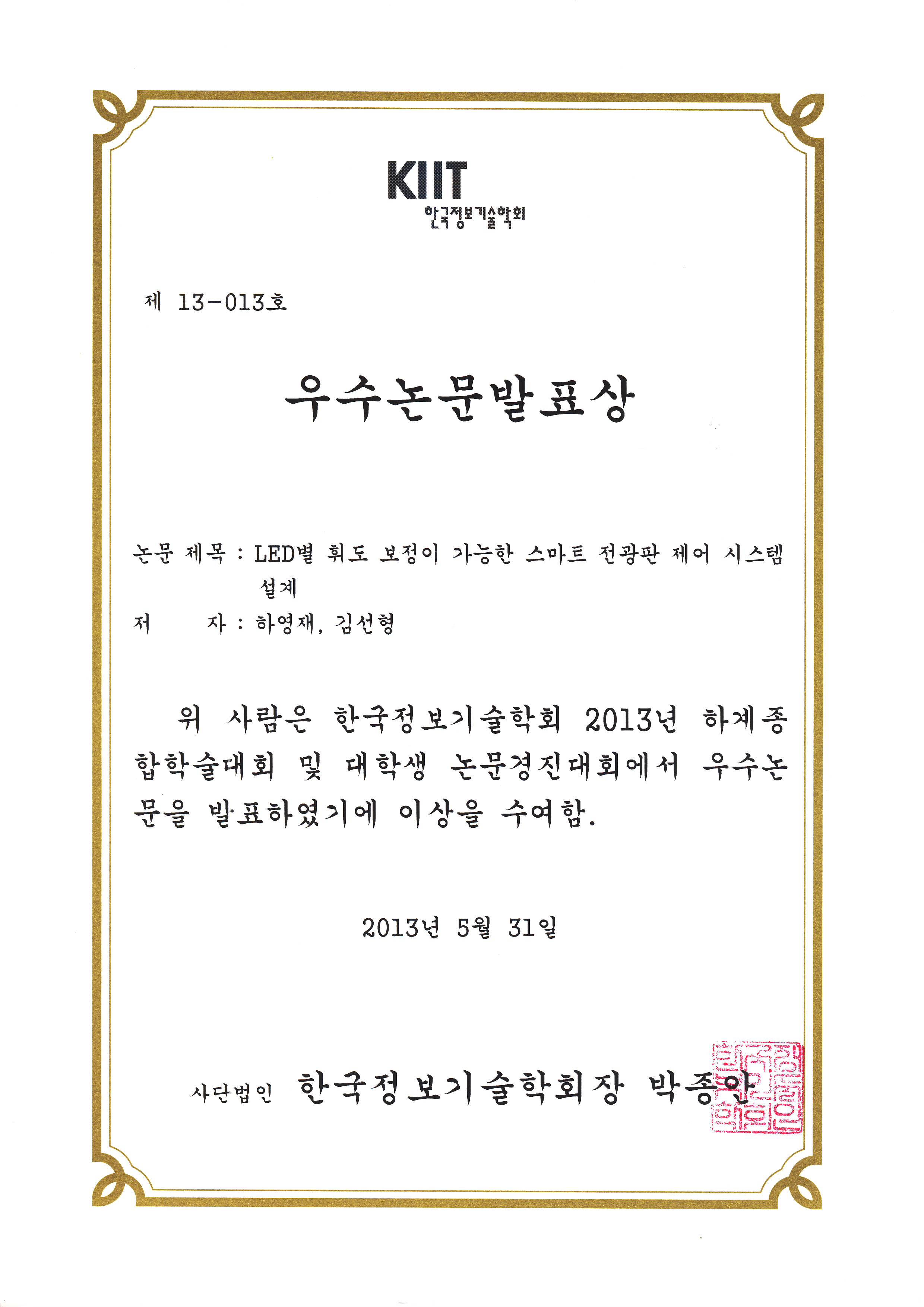 2013 한국정보기술학회 우수논문발표상 수상