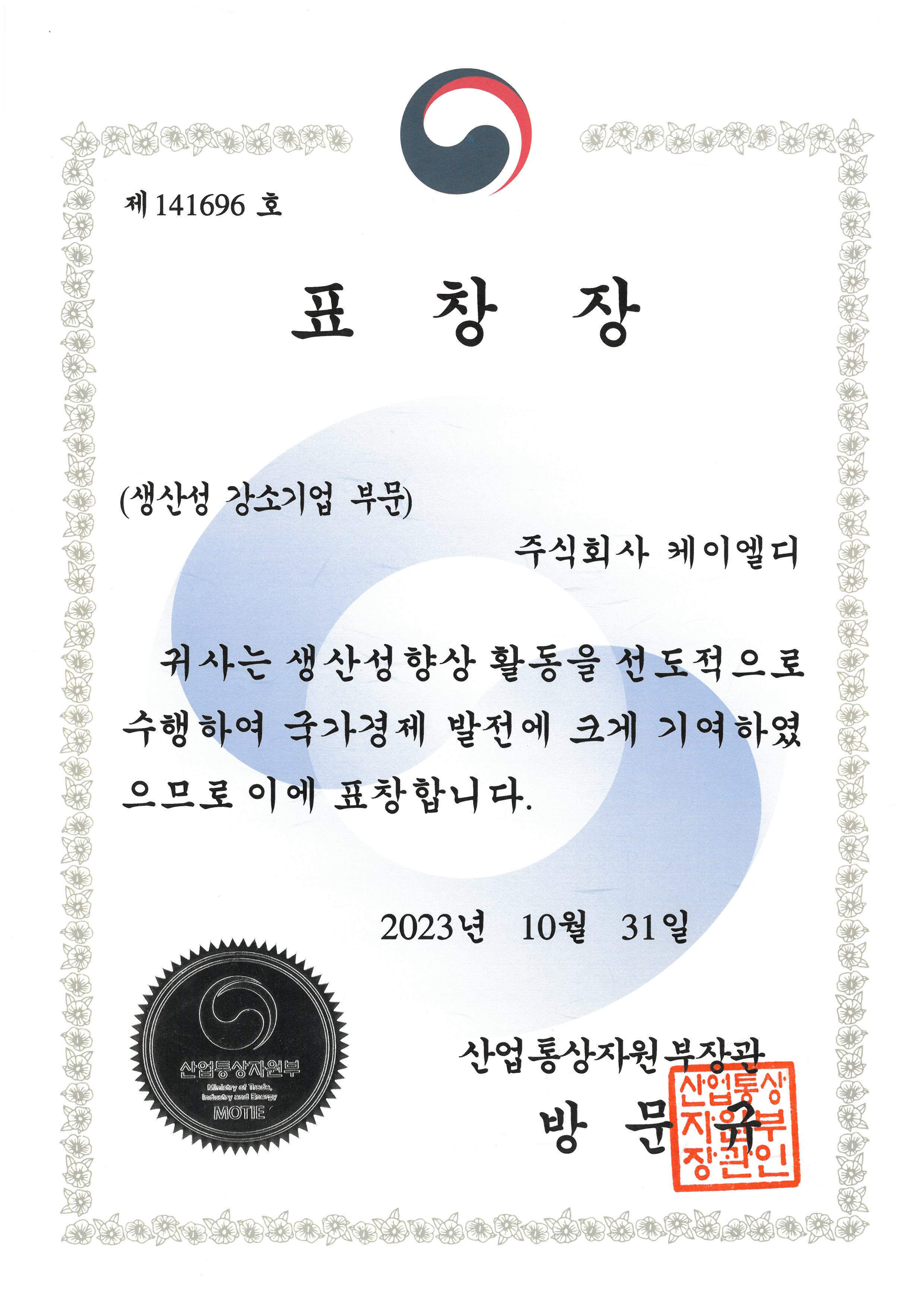 산업통상자원부 생산성강소기업부문 수상