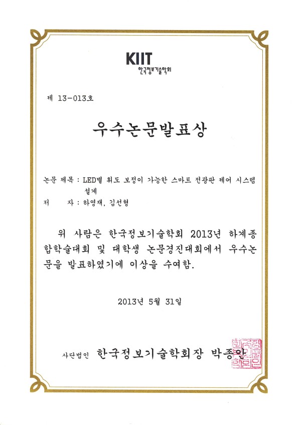 2013 한국정보기술학회 우수논문발표상 수상 페이지 정보 작성자 최고관리자 댓글 0건 조회 47회 작성일 19-12-10 15:29 목록 본문 2013 한국정보기술학회 우수논문발표상 수상 이전글2016 한국정보기술학회 우수논문발표상 수상 19.12.10 다음글과학기술훈장 수훈 16.07.04
