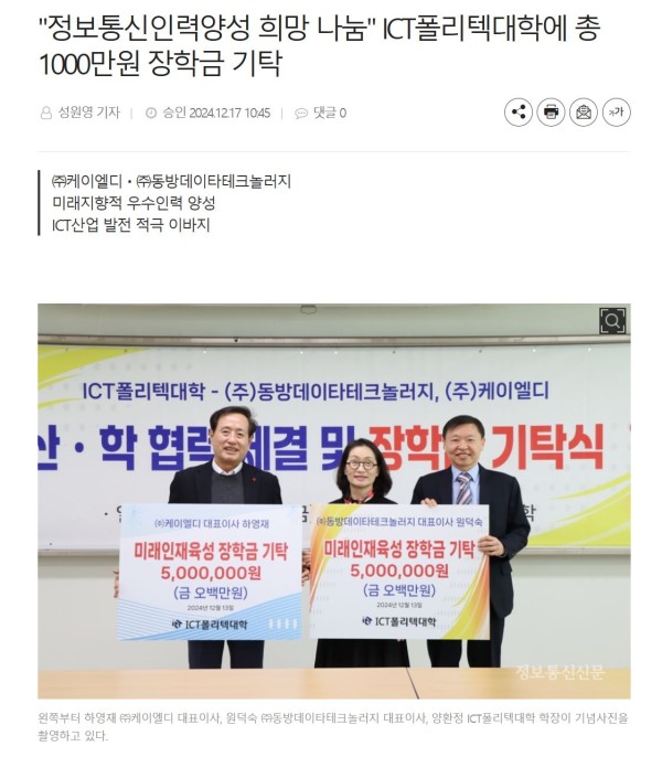 "정보통신인력양성 희망 나눔" ICT폴리텍대학에 총 1000만원 장학금 기탁 - 정보통신신문 페이지 정보 댓글 0건 조회 740회 작성일 24-12-30 13:09 목록 본문 "정보통신인력양성 희망 나눔" ICT폴리텍대학에 총 1000만원 장학금 기탁 - 정보통신신문 이전글특허뉴스 1월호 광고 게재 25.01.15 다음글ICT 폴리텍 대학-(주)케이엘디 산·학 협력 체결 및 장학금 기탁 24.12.16