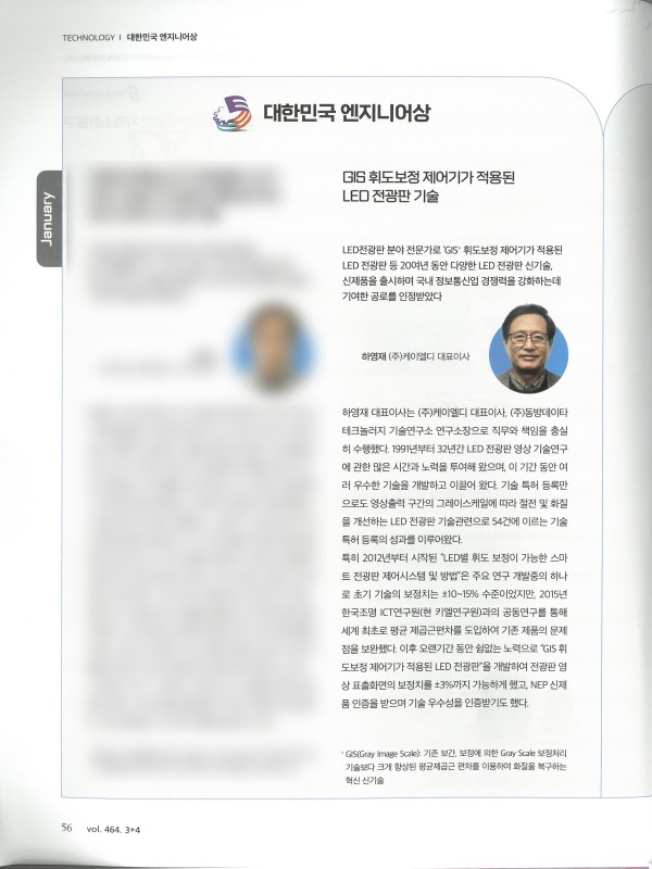 기술과혁신 3+4월호에 소개된 하영재 대표 대한민국 엔지니어상 수상 소식입니다.
