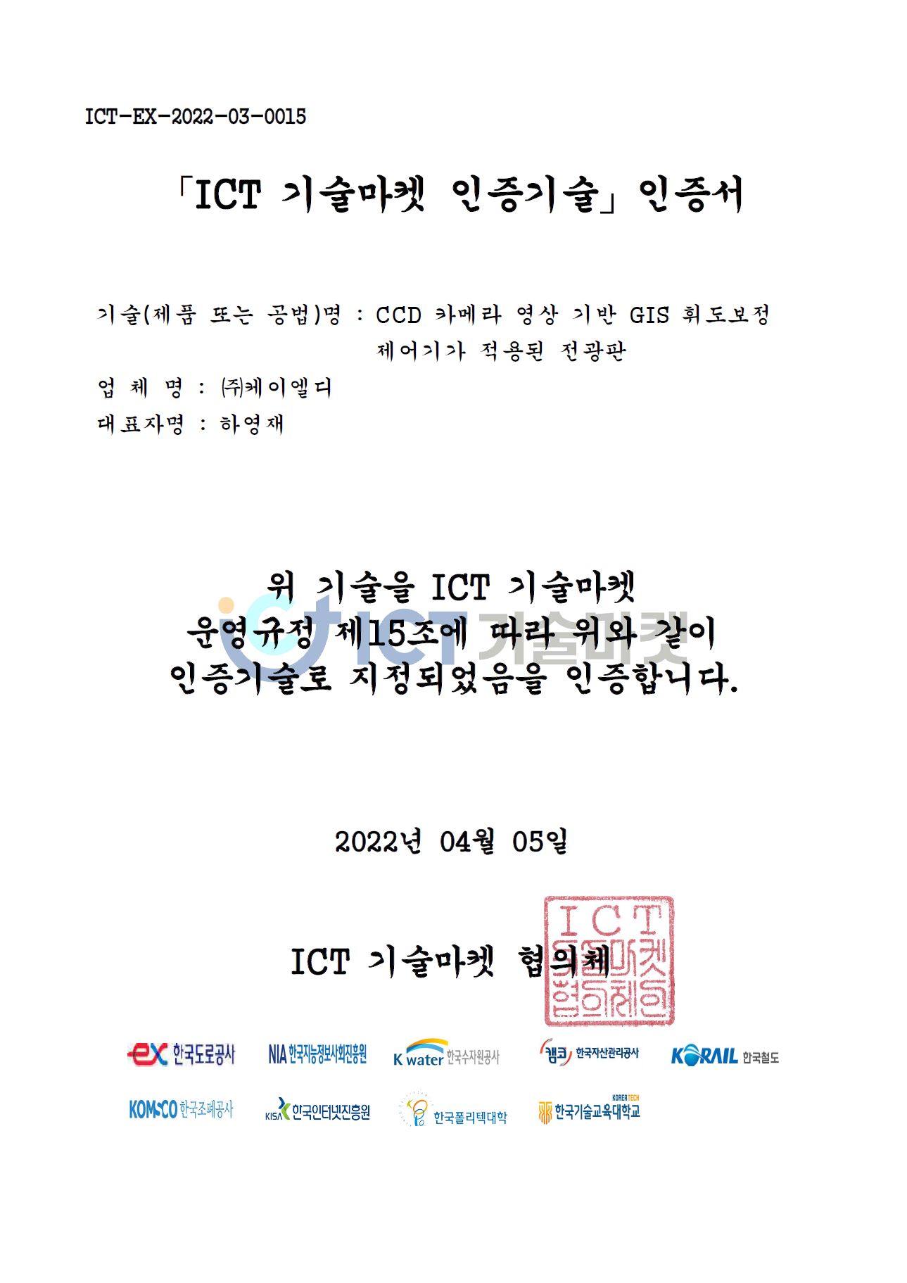 ICT 기술마켓 인증기술 인증서 획득 -CCD 카메라 영상 기반 GIS 휘도보정 제어기가 적용된 전광판 페이지 정보 댓글 0건 조회 1,111회 작성일 22-04-06 16:41 목록 본문 ICT 기술마켓 인증기술 이전글코리아 나라장터 엑스포 전시회 "2022 KOPPEX 기술마켓" 전시회 참가 22.04.18 다음글하영재 대표 이노비즈 협회 고문 위촉 22.03.21