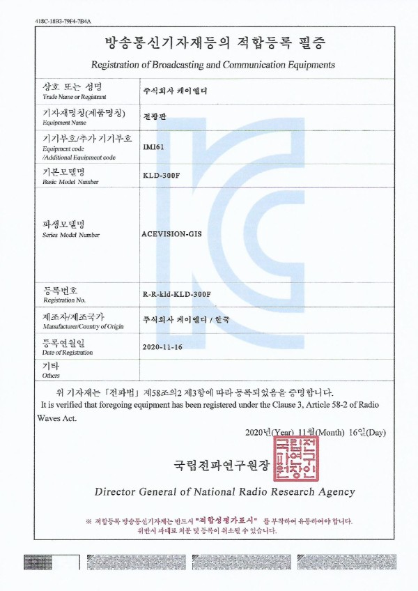 전자파 인증 획득 - KLD-300F 페이지 정보 댓글 0건 조회 1,323회 작성일 20-11-20 10:08 목록 본문 전자파 인증 획득 - KLD-300F 이전글NEP 인증 획득 - CCD 카메라 영상 기반 GIS 휘도보정 제어기가 적용된 전광판 20.12.17 다음글해외특허 - LED ELECTRONIC BULLETIN BOARD ENABLING HIGH-SPEED IMAGE CALIBRATION 20.07.31