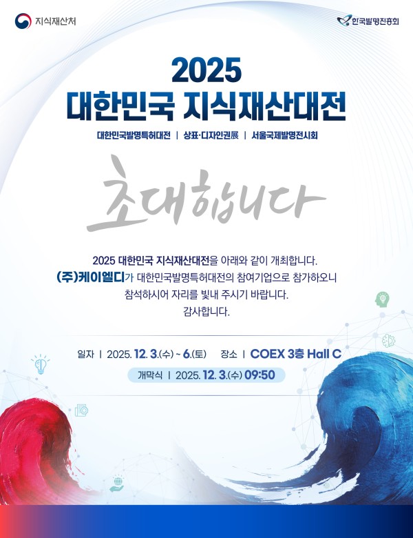 2025년 대한민국 지식재산대전에 초대합니다. 페이지 정보 댓글 0건 조회 123회 작성일 25-11-18 12:54 목록 본문 2025년 대한민국 지식재산대전에 초대합니다 이전글대한민국 지식재산대전 한국특허정보원장상 수상 25.12.05 다음글기업 전시 홍보관 오픈 안내 25.10.30